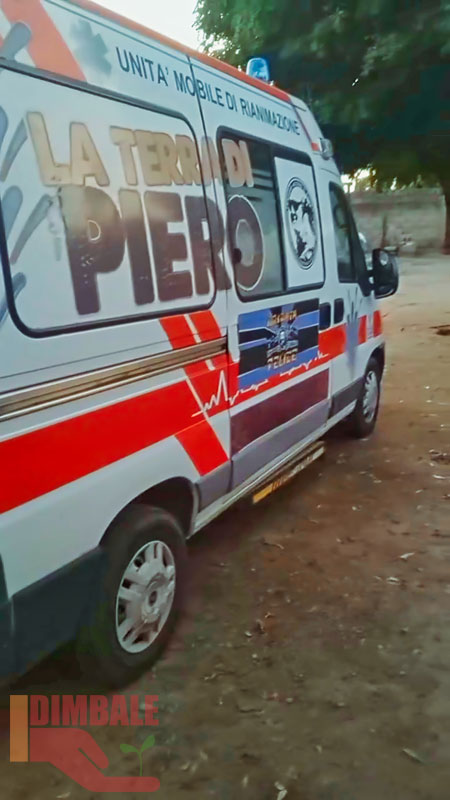 Gespendet wurde der gebrauchte Rettungswagen von einer italienischen Organisation. DIMBALE konnte dank privater Spenden für Baba die Kosten von kleinen Reparaturen am Auto sowie für die erste Tankfüllung übernehmen. Wir wünschen Baba und allen Mitfahrenden stets unfallfreie Fahrten. Möge die Ambulanz vielen Betroffenen helfenn.